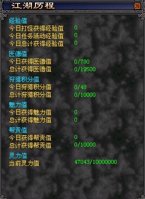 江湖历程面板中记录了玩家需要统计的部分信息,可以供大家方便快捷的查看累计获得的经验,医德值等